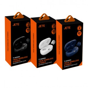 Headphone JETE series pertama tanpa kabel memberikan kenyamanan dan kebebasan tersendiri saat digunakan untuk mendengarkan musik dan mengelola panggilan anda dengan TWS JETE T1 series, kemampuan menghasilkan audio yang jernih dan super bass karena sudah di dukung koneksi Bluetooth V5.0.
